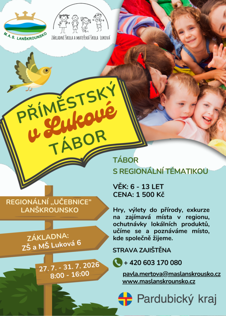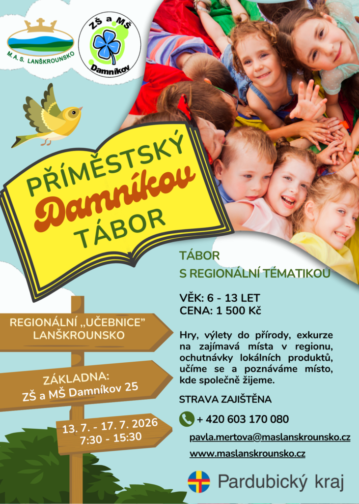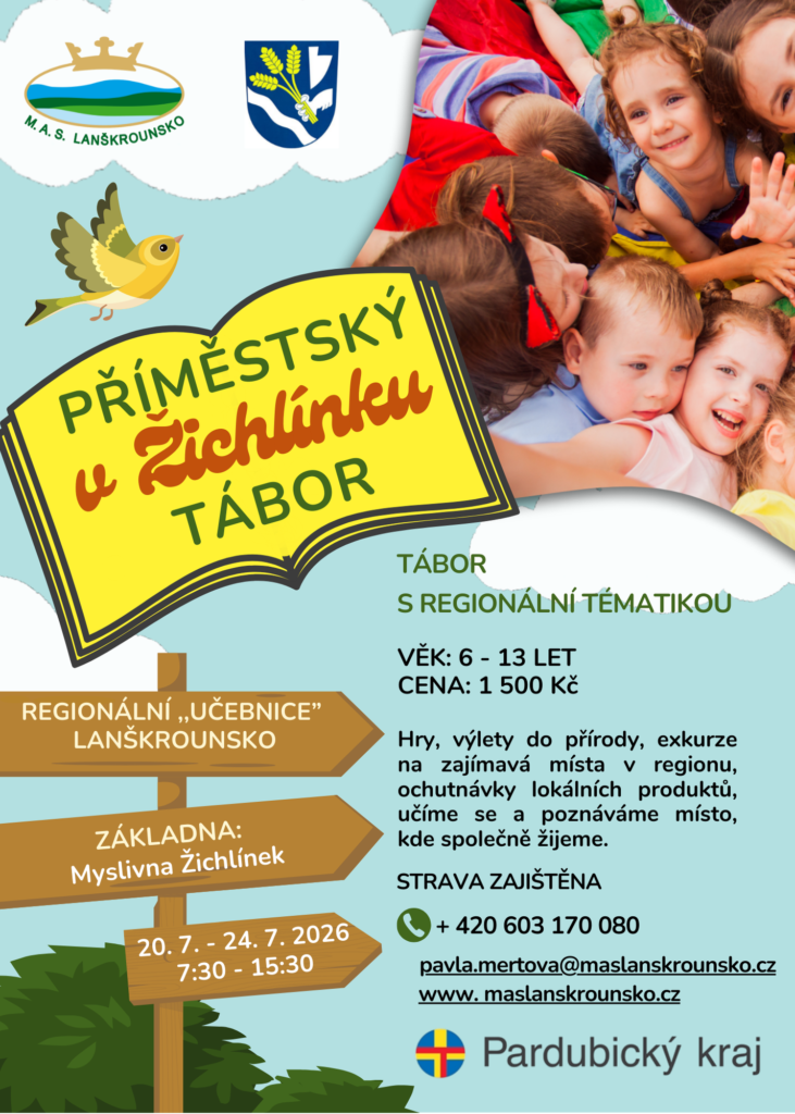 Na léto 2026 jsme opět připravili sérii příměstských táborů pro děti ve věku 6–15 let, které se uskuteční v pěti obcích Lanškrounska – Žichlínek, Damníkov, Luková, Lubník a Cotkytle. Každý turnus nabídne pestrý program zaměřený na regionální výuku, poznávání místního prostředí a aktivní trávení času v přírodě.
