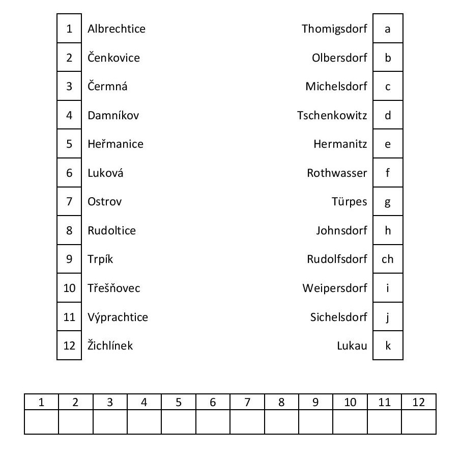 Vezměte tužky do ruky a pusťte se do luštění. Vaším úkolem je spojit dohromady české a německé názvy obcí – soutěžní zadání naleznete ZDE.